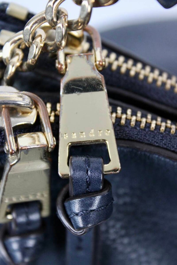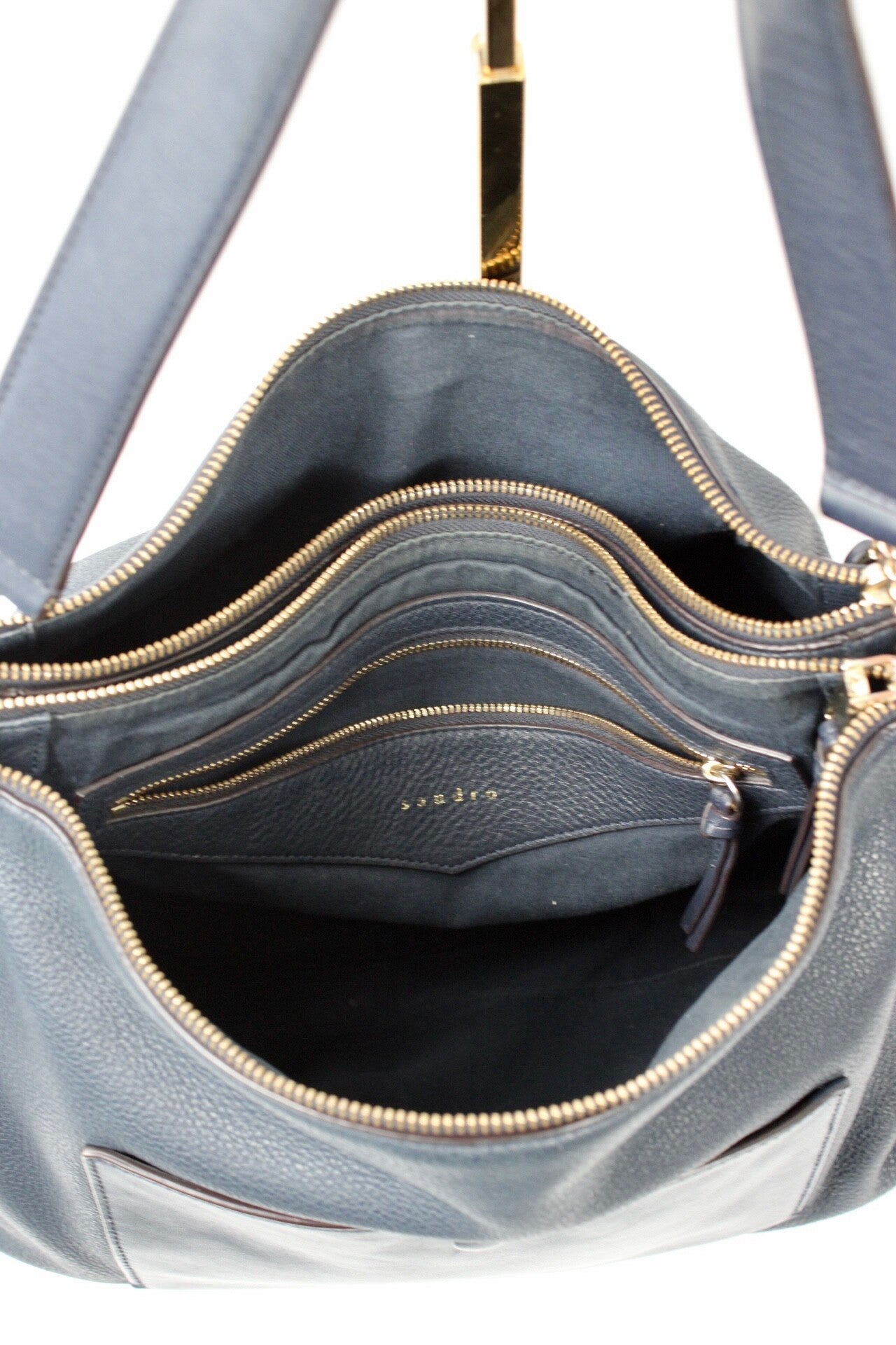 Een prachtige handtas uit een zeer soepel leder, afgewerkt met gouden details die mooi afsteken tegenover de donkerblauwe kleur.