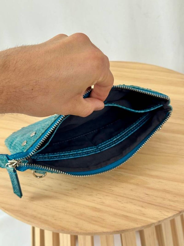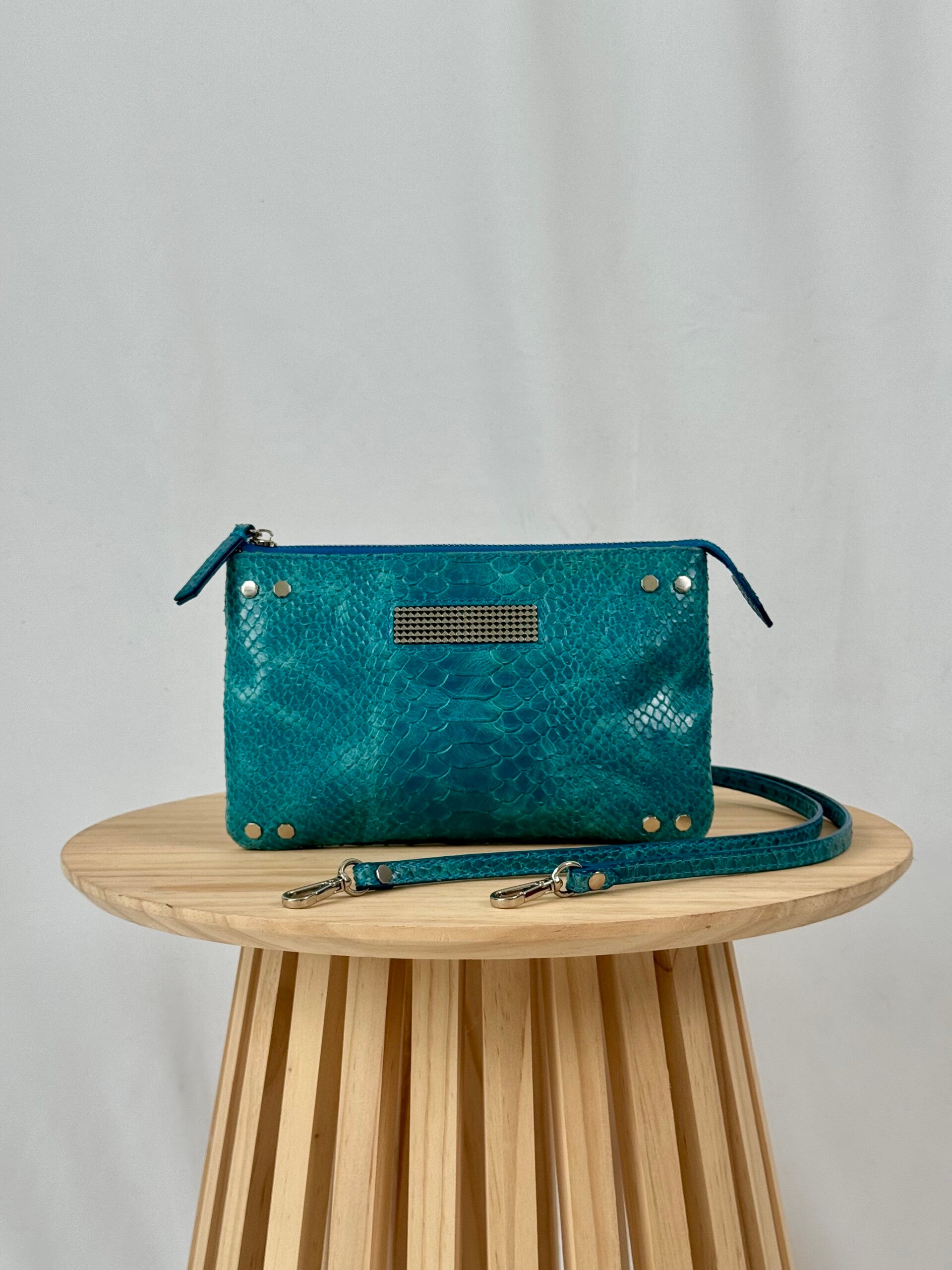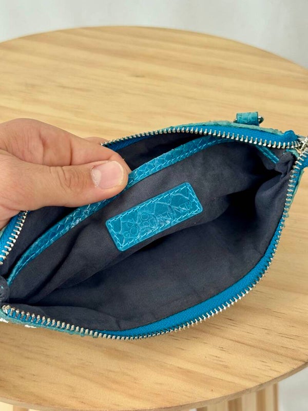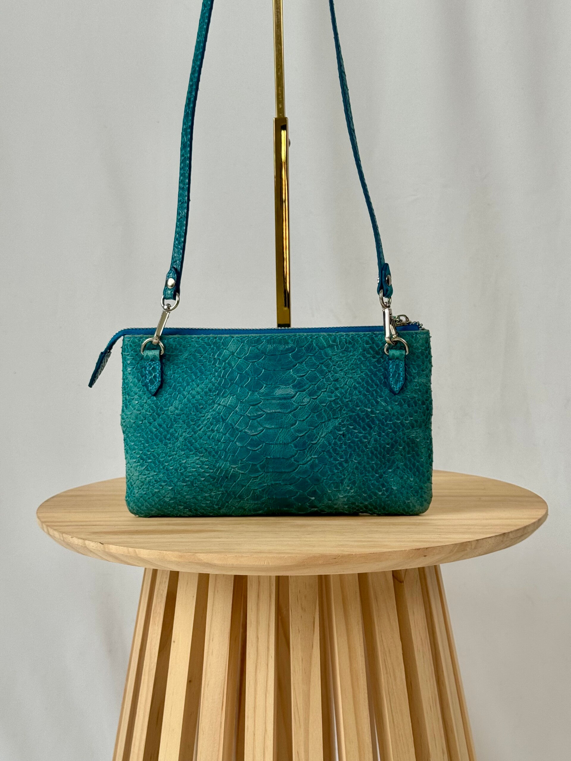 Color: blue croco print with golden hardware