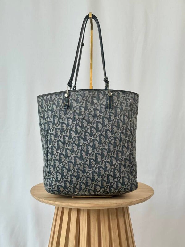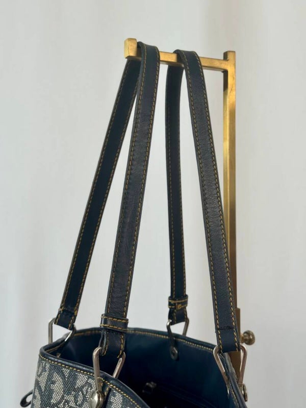 Color: blue and grey Oblique print with Navy blue leather details, orange trim.