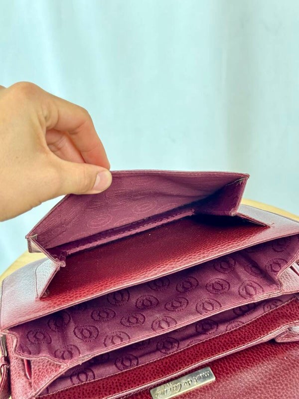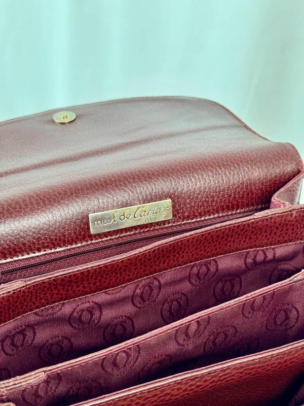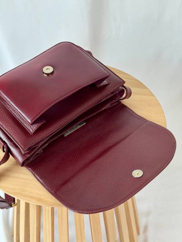 Color: dark red grained leather with parts smooth burgundy leather. Golden hardware