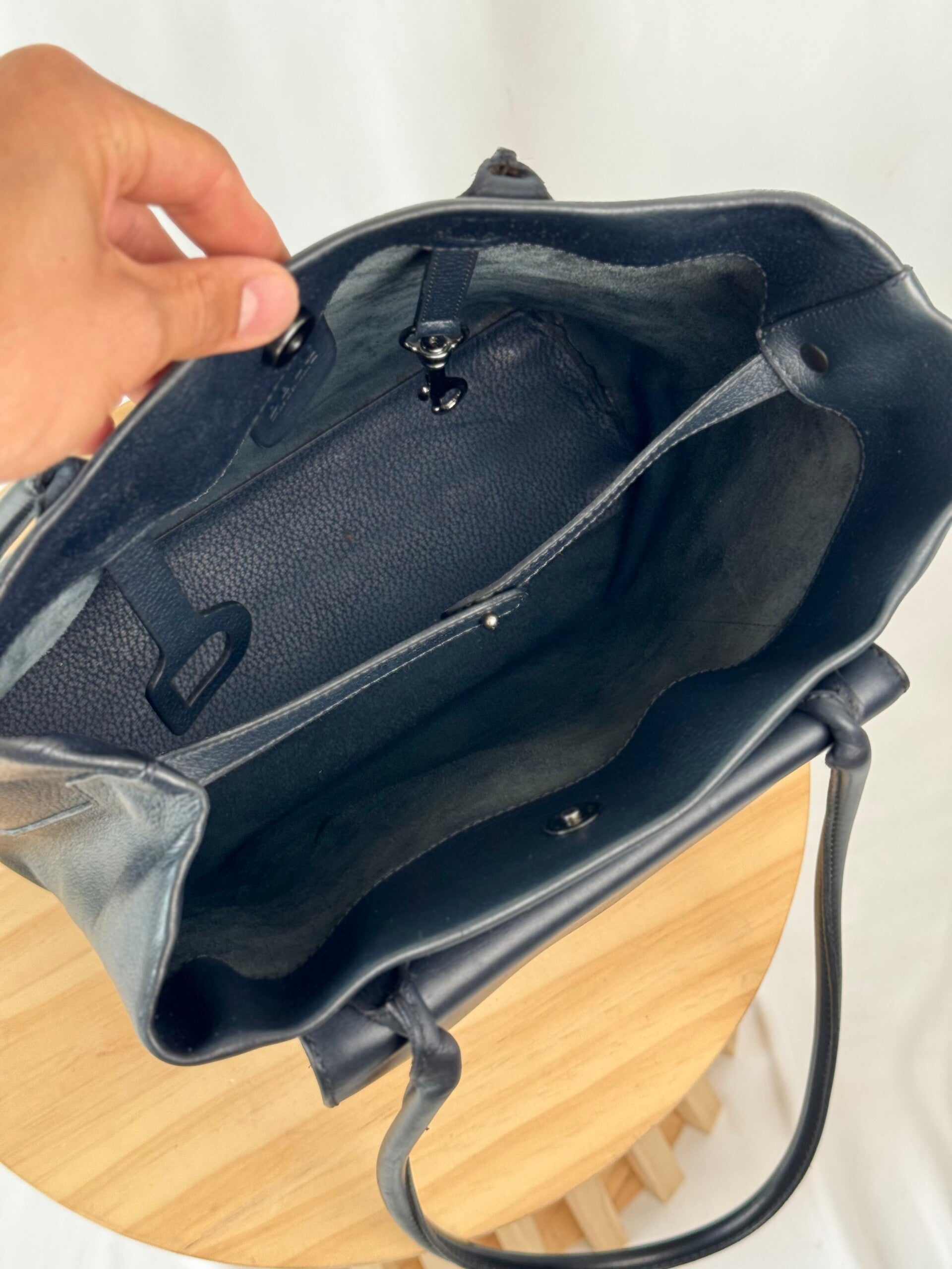 Color: dark blue grained leather, pocket is from smooth leather with palladium hardware.