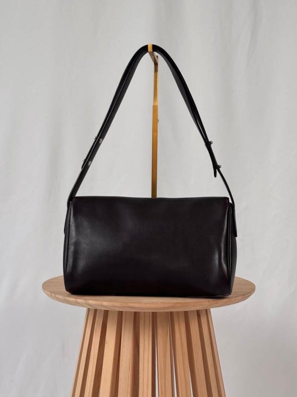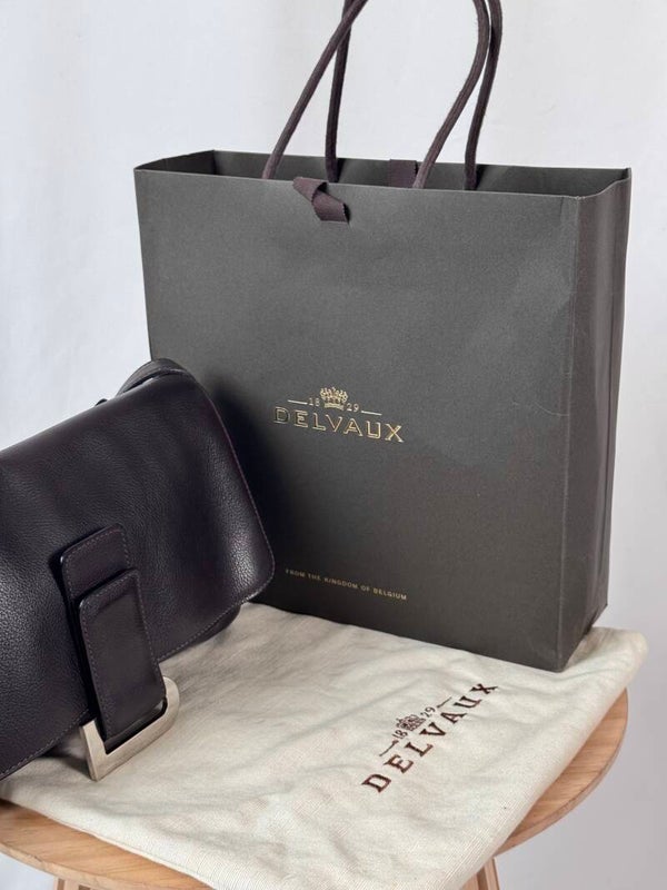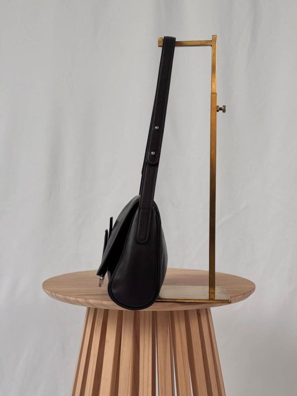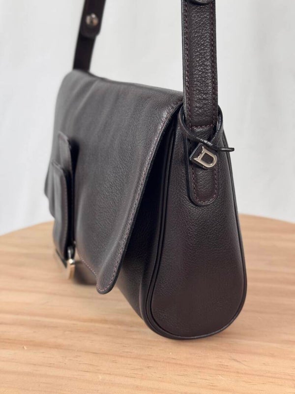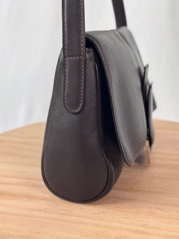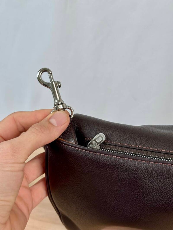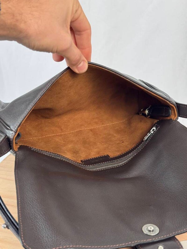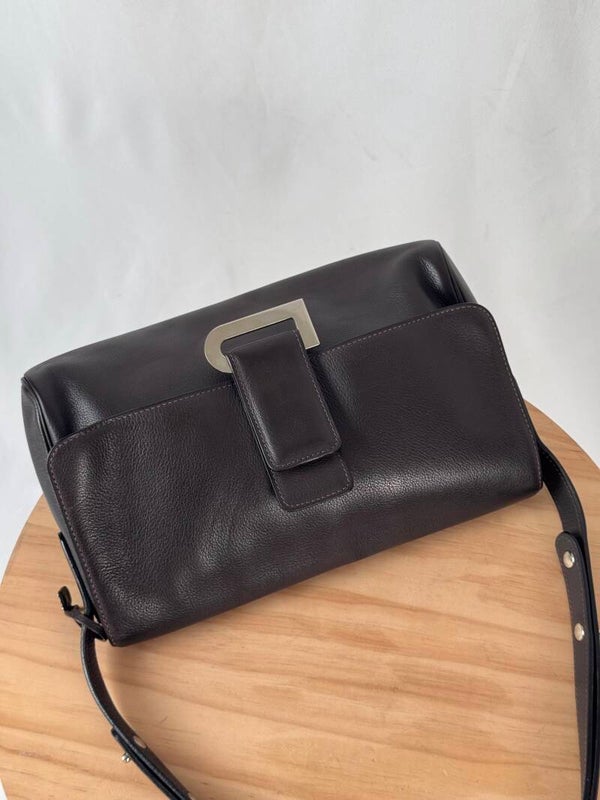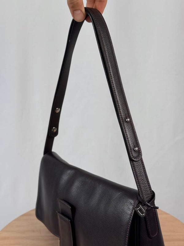 Color: dark brown calfskin leather with beige stitching and silver hardware