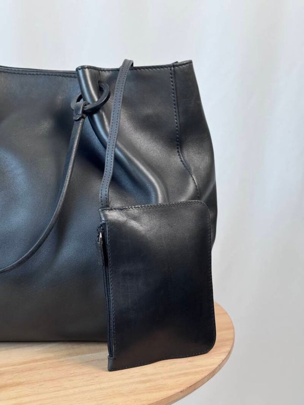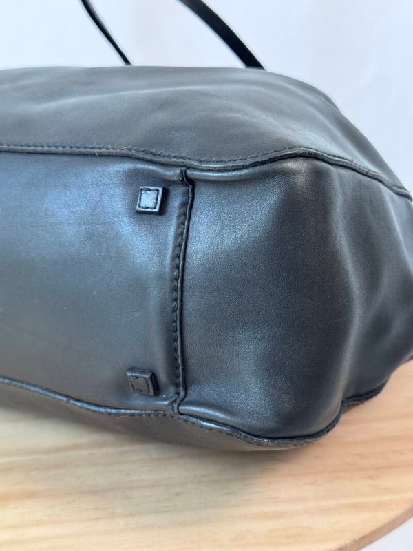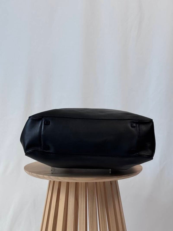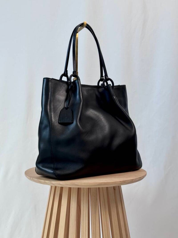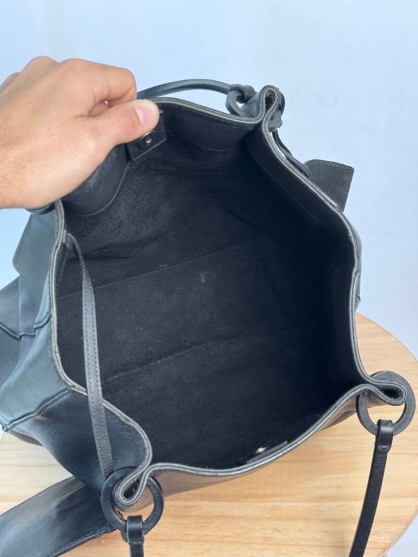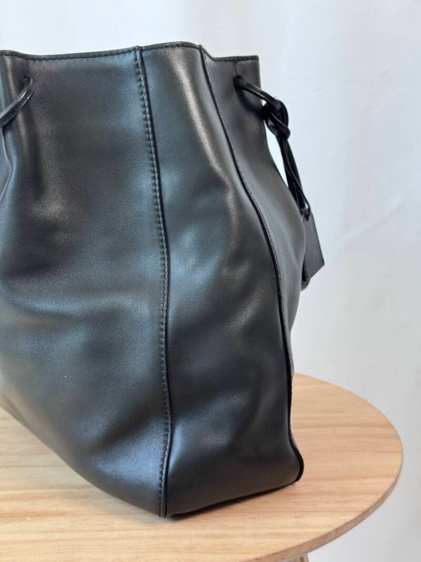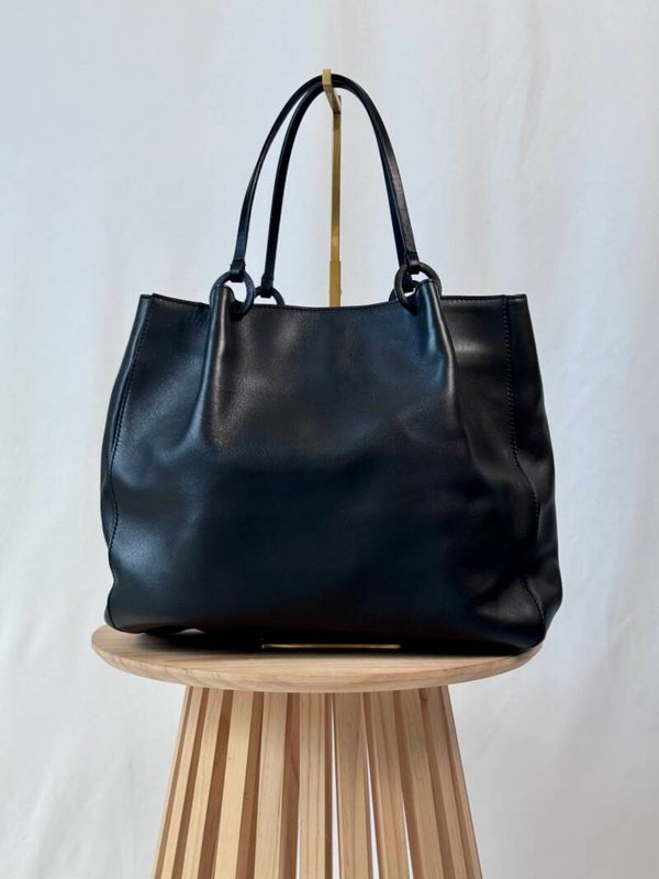 Color: Black smooth calfskin leather, silver magnet hardware. Handles and rings are made of same calfskin leather.