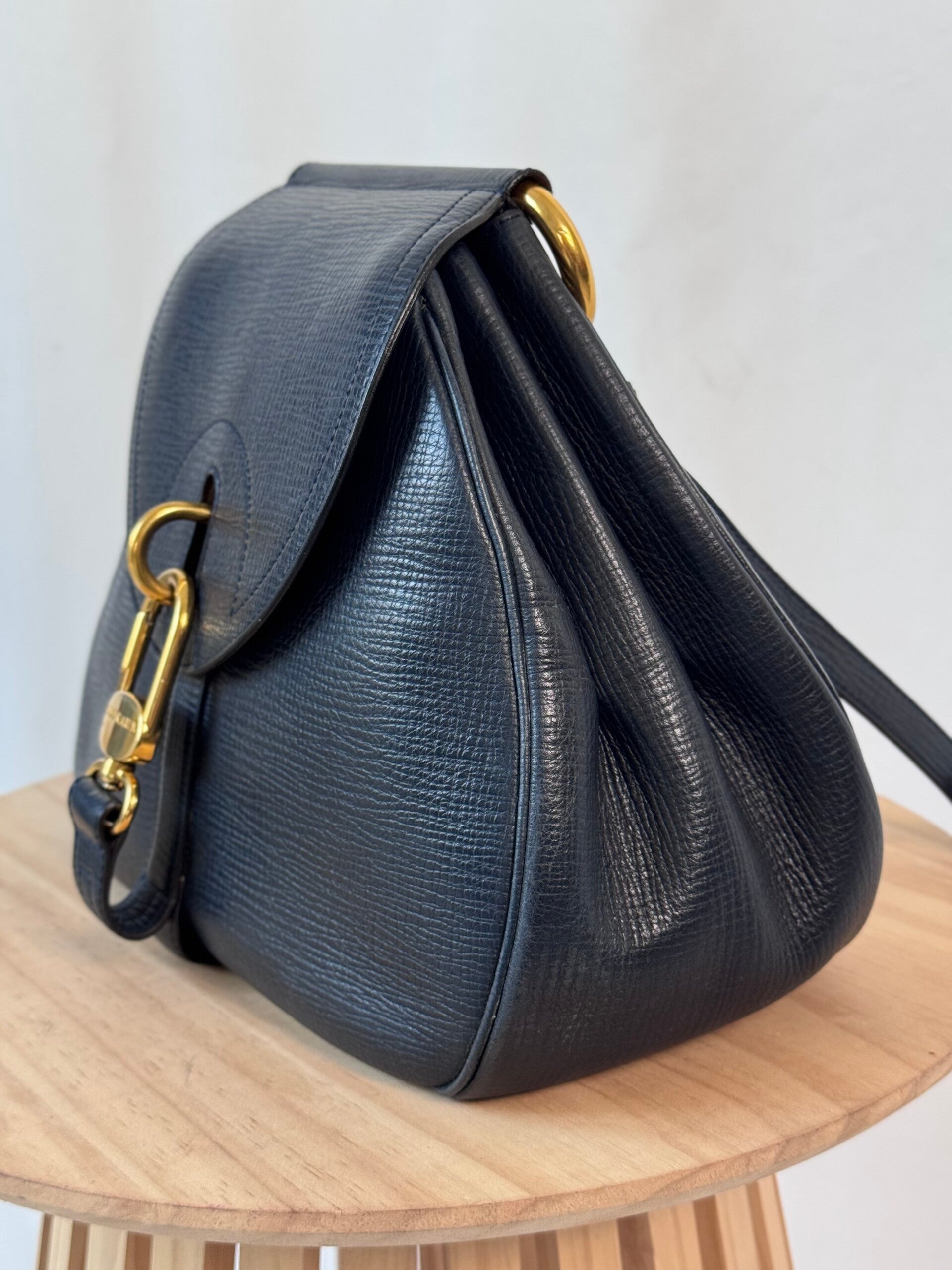 Color: Navy blue leather with golden details on the handle and hardware