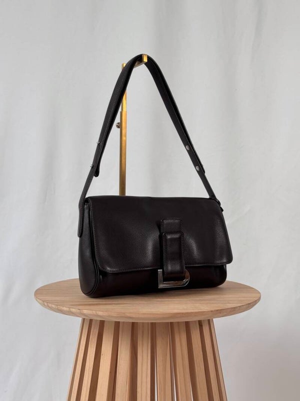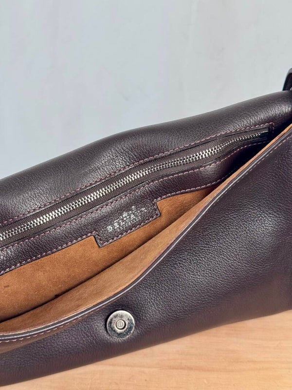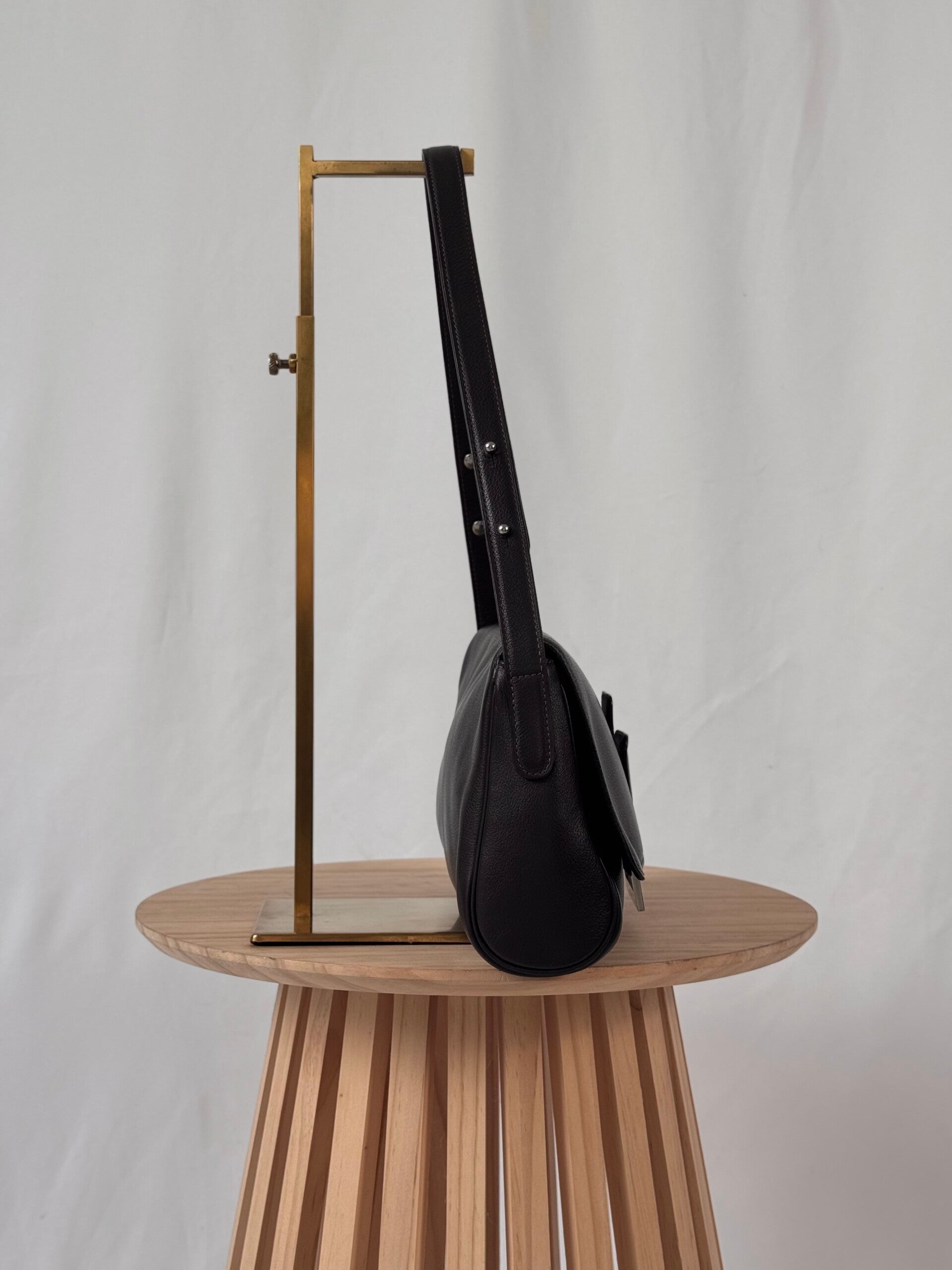 Color: dark brown calfskin leather with beige stitching and silver hardware