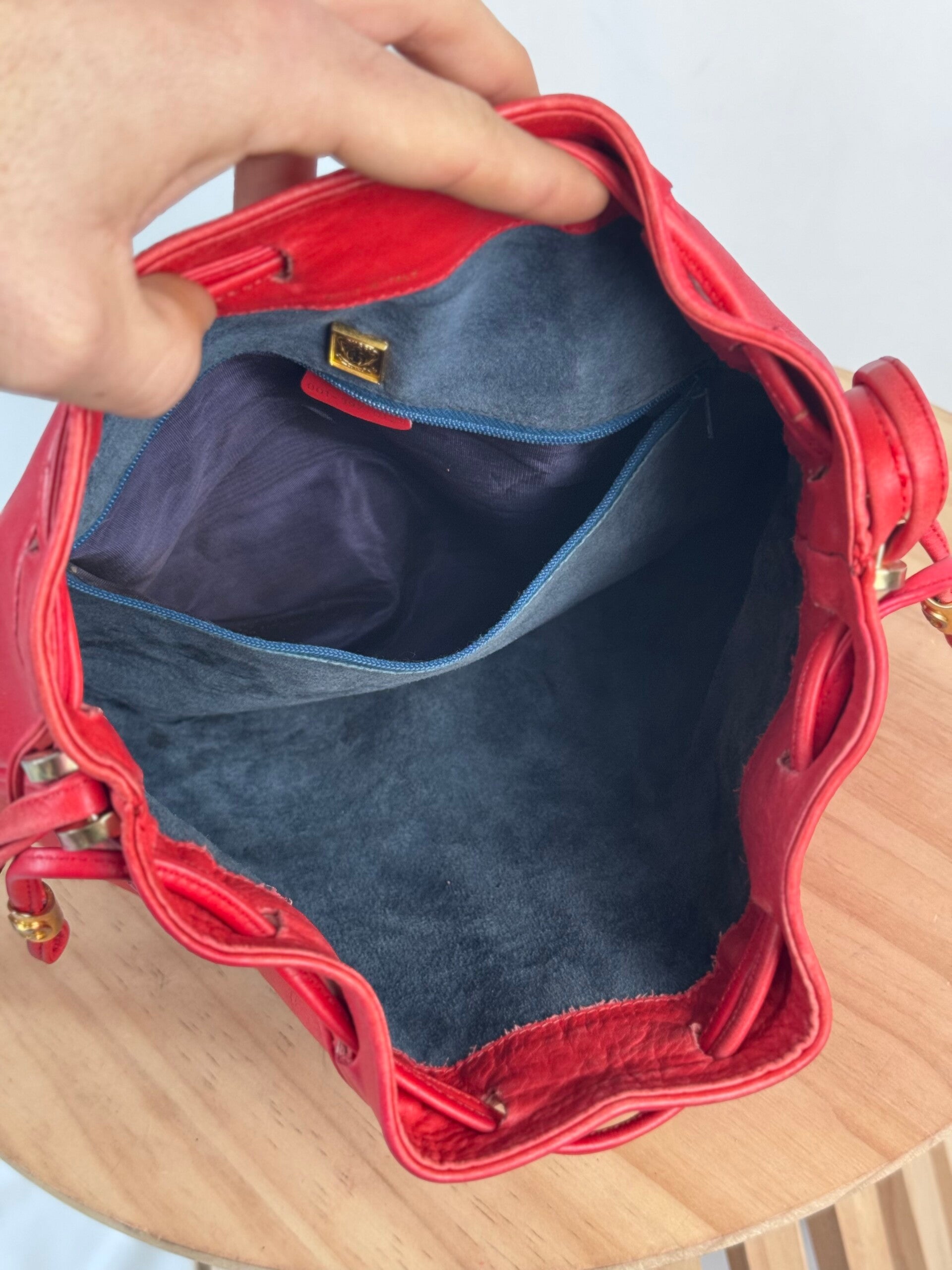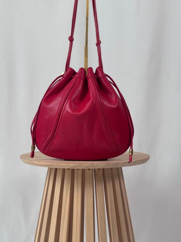 Color: funky red calfskin leather with golden details and suède inside.