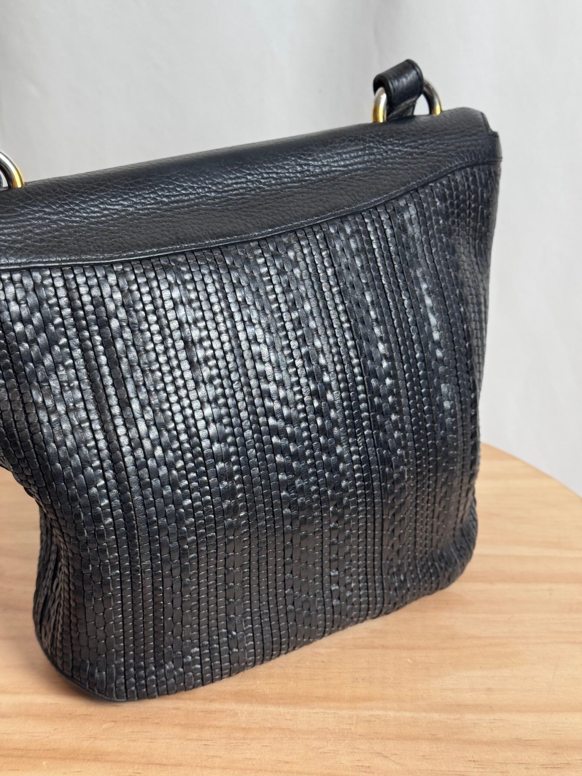 Color: Black heavy grained leather on the flap/shoulderstrap, TDC finish on the rest of the bag. Golden hardware