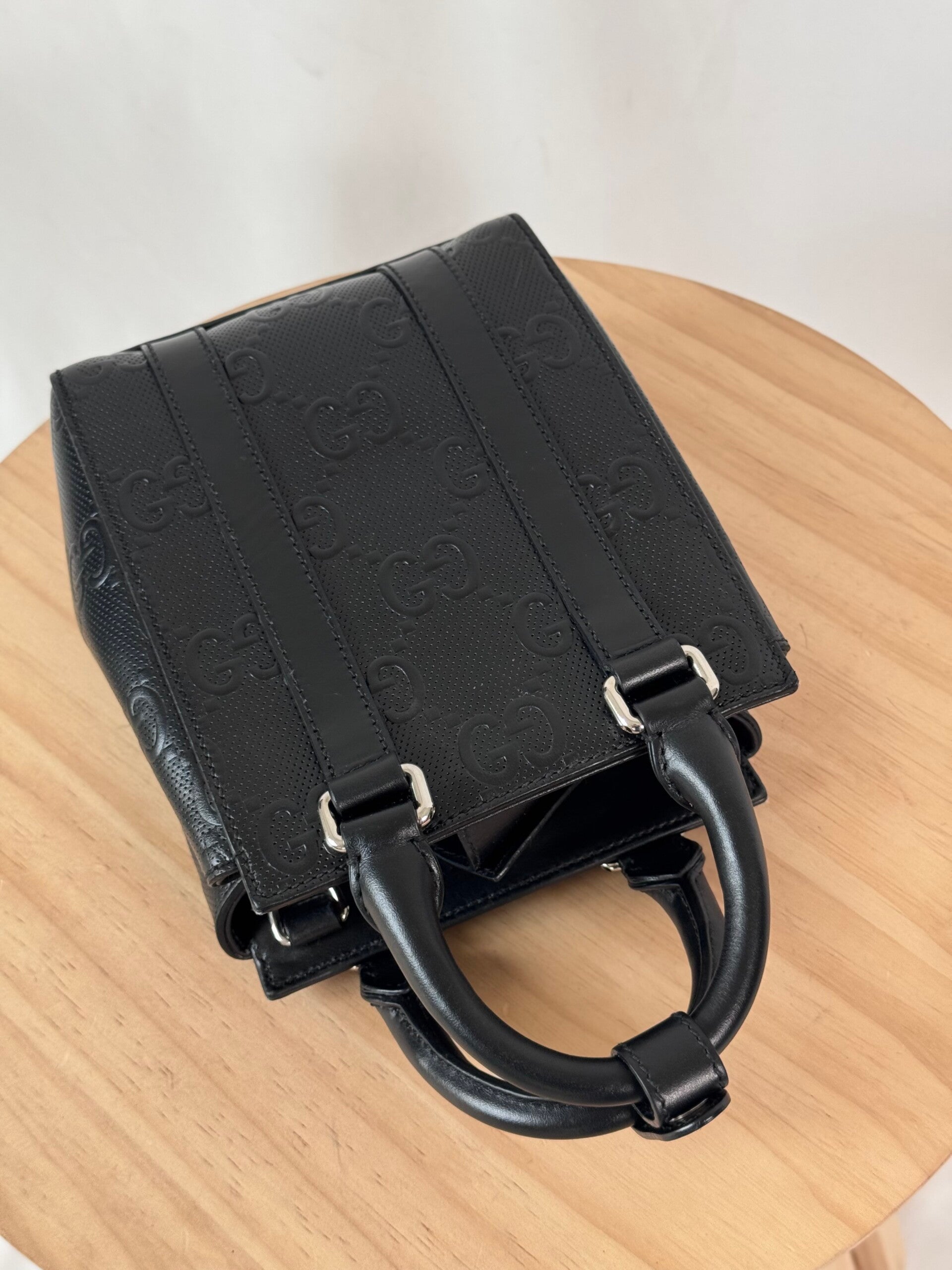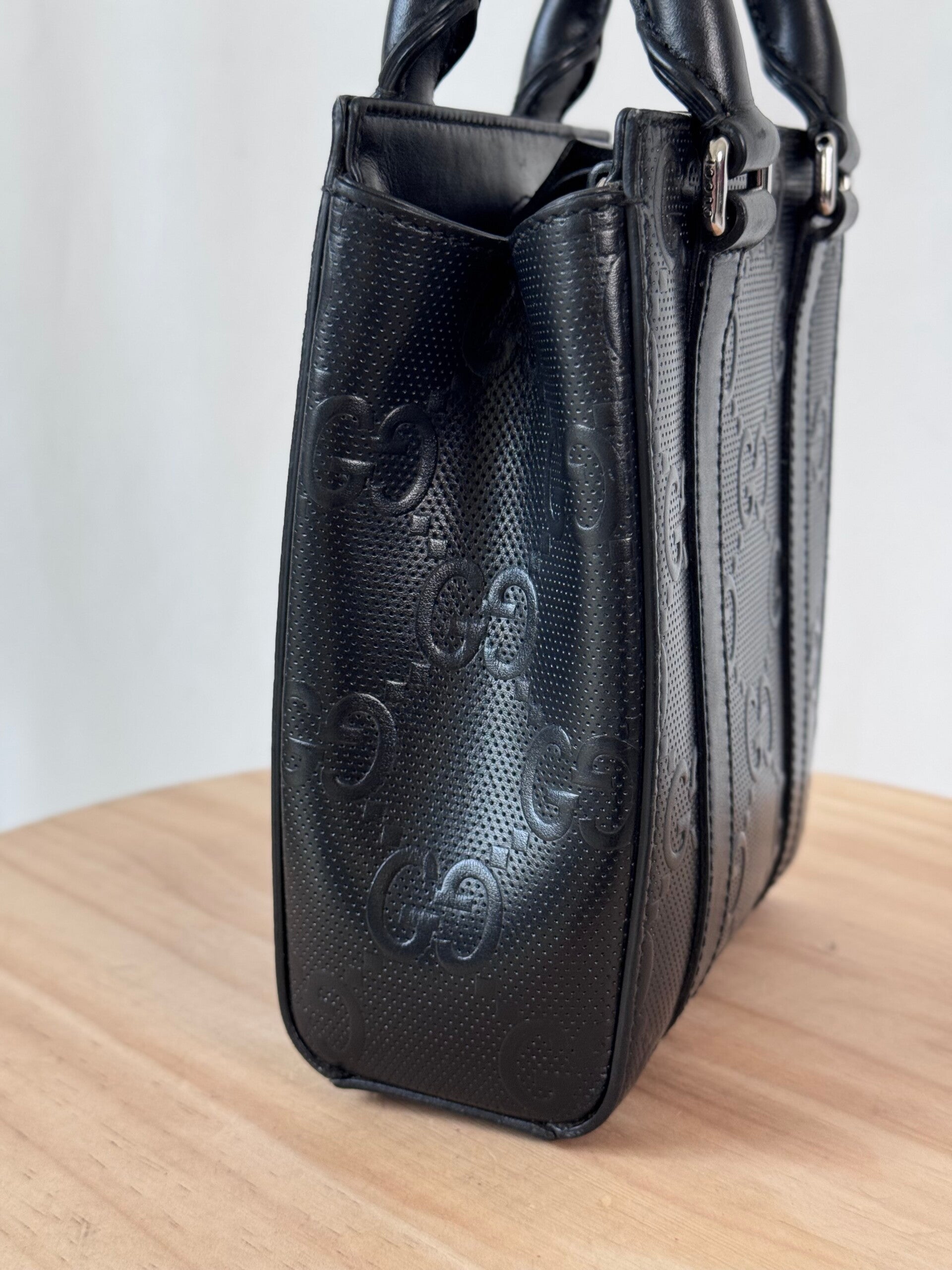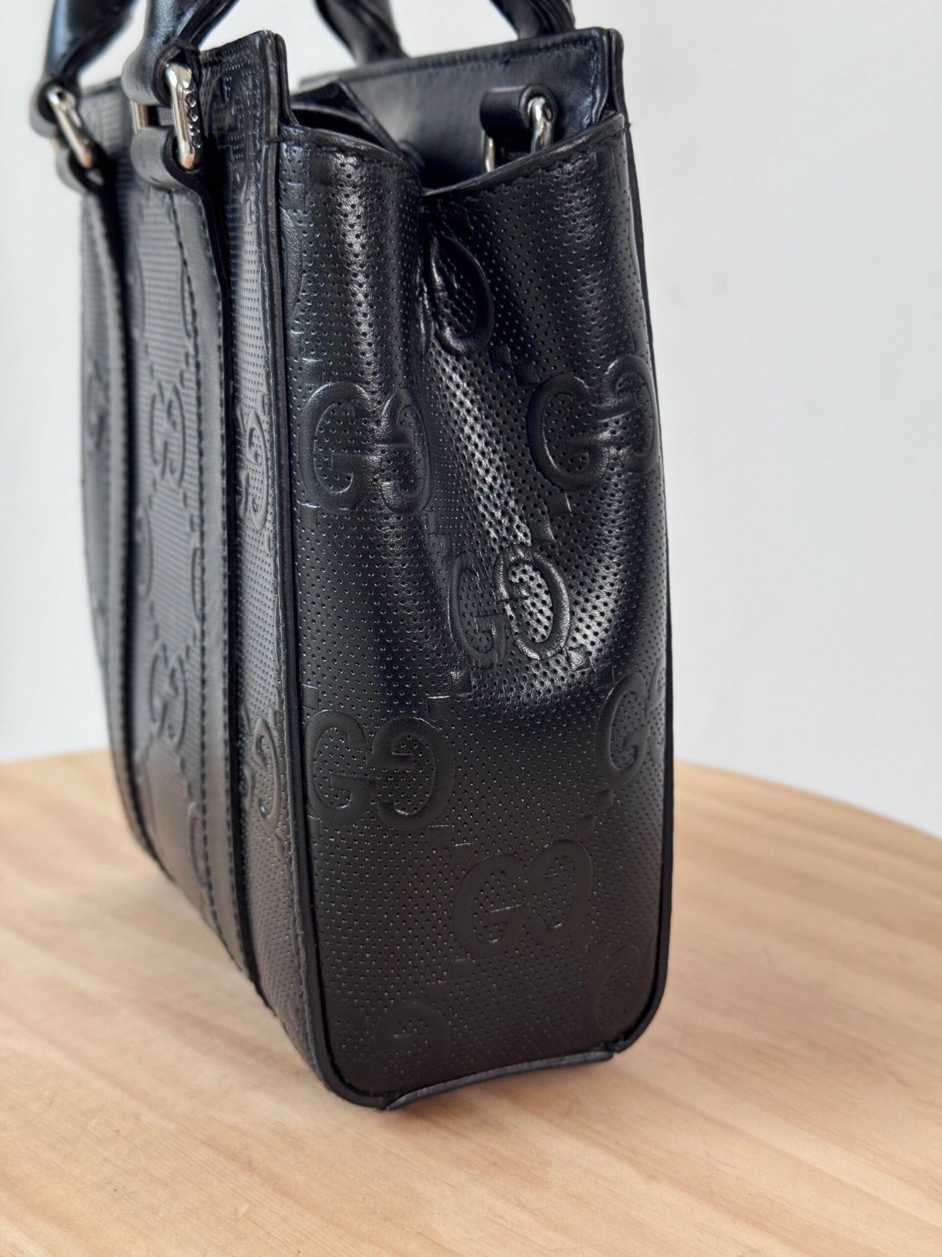 Color: Black perforated GG embossed leather with linen interior and silver hardware