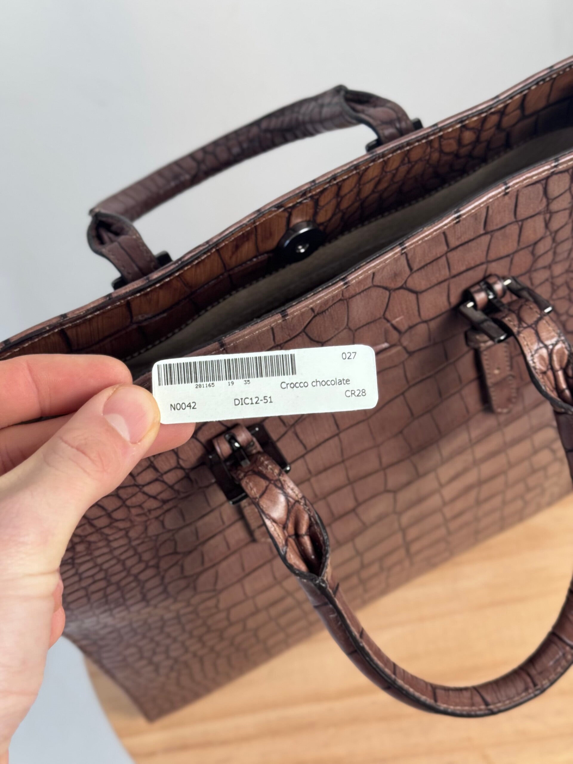 Color: Chocolate brown croco embossed calfskin leather with palladium hardware