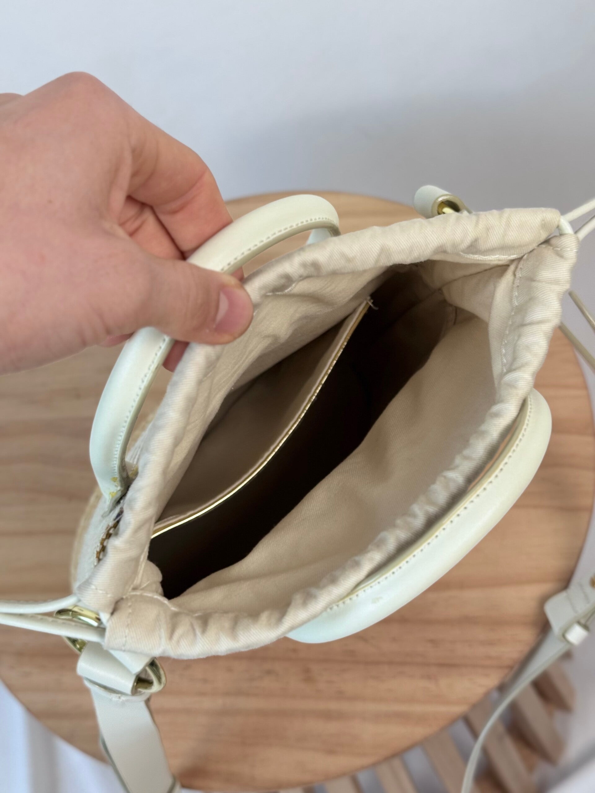 Color: color blocked woven exterior, gold toned hardware, soft beige drawstring pouch and off white faux leather handles and details.