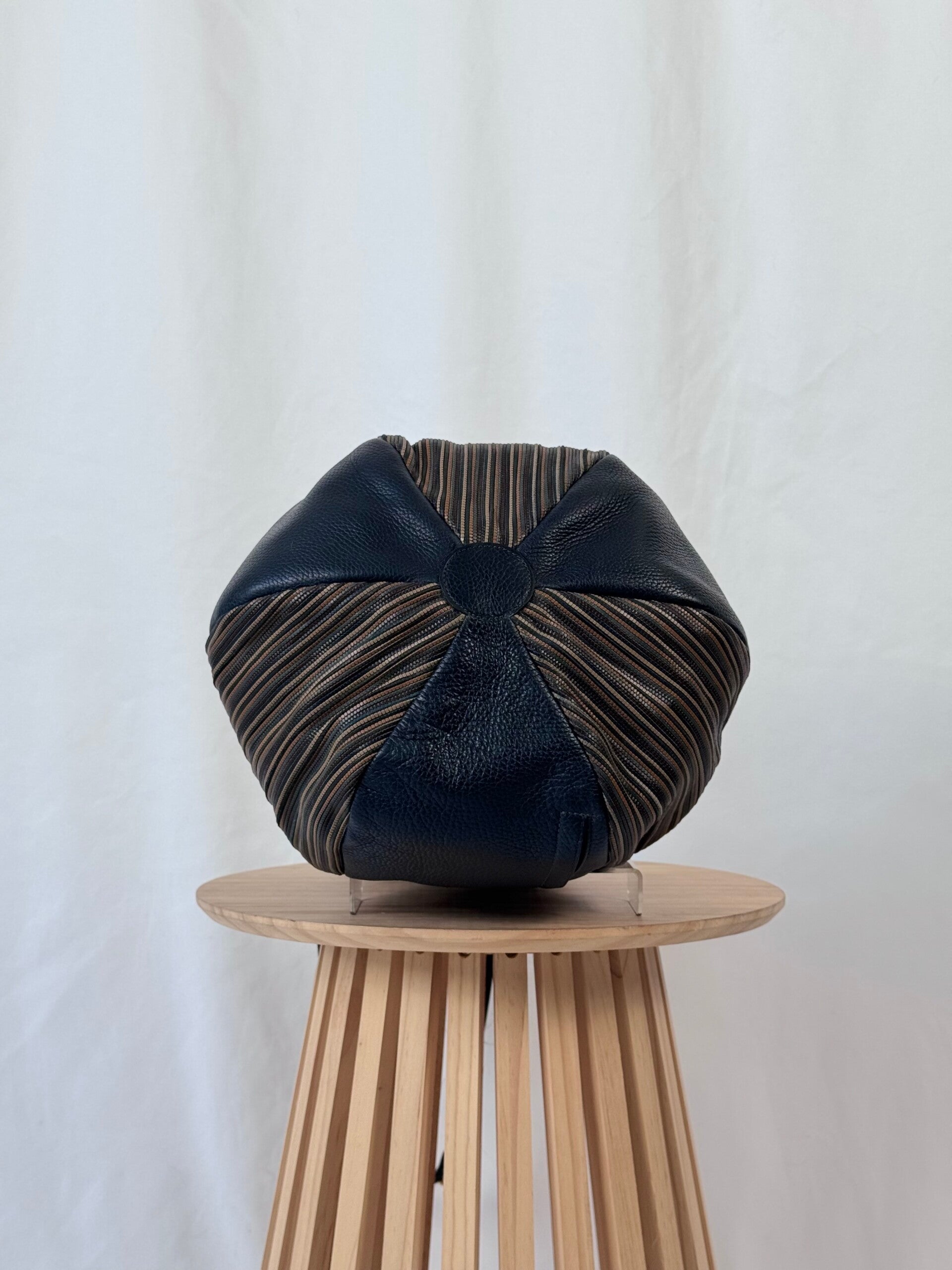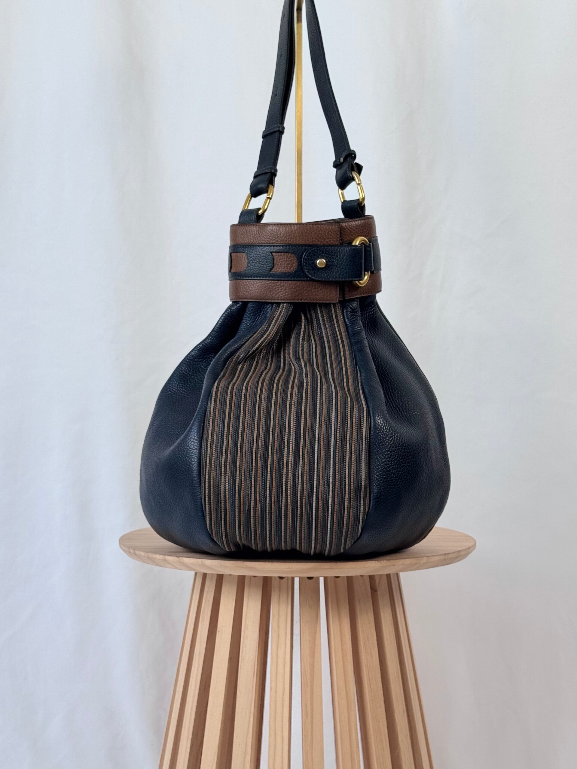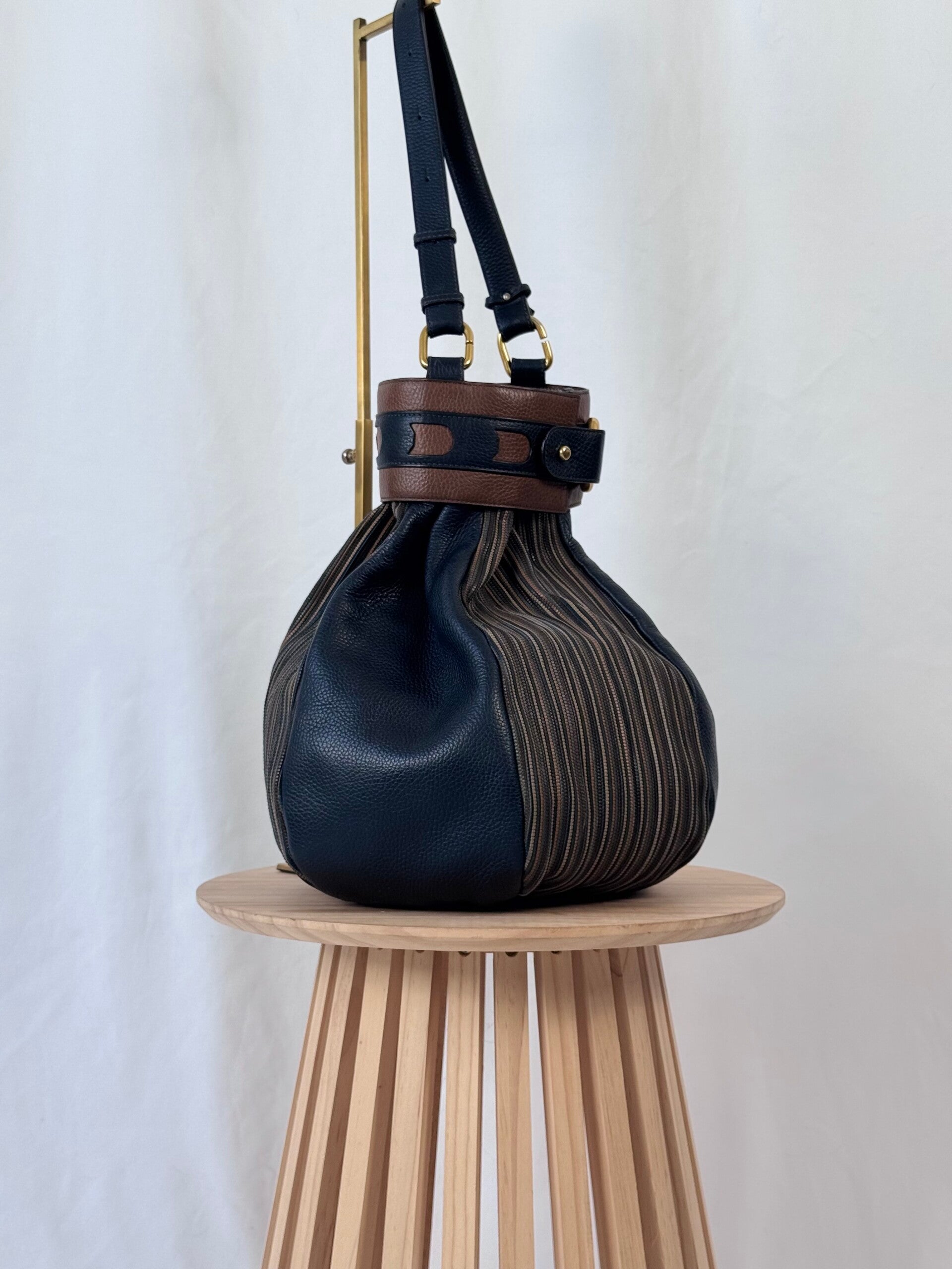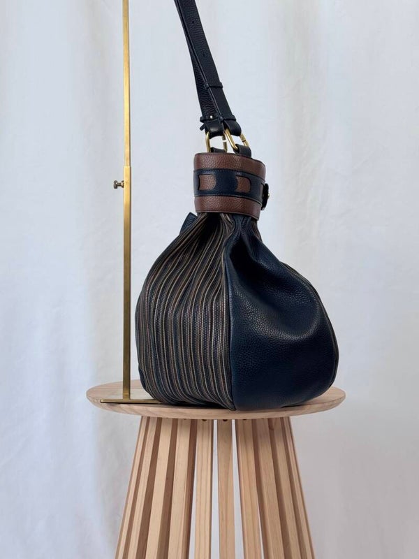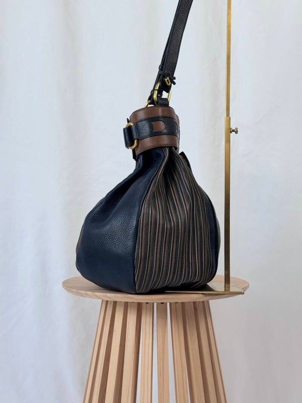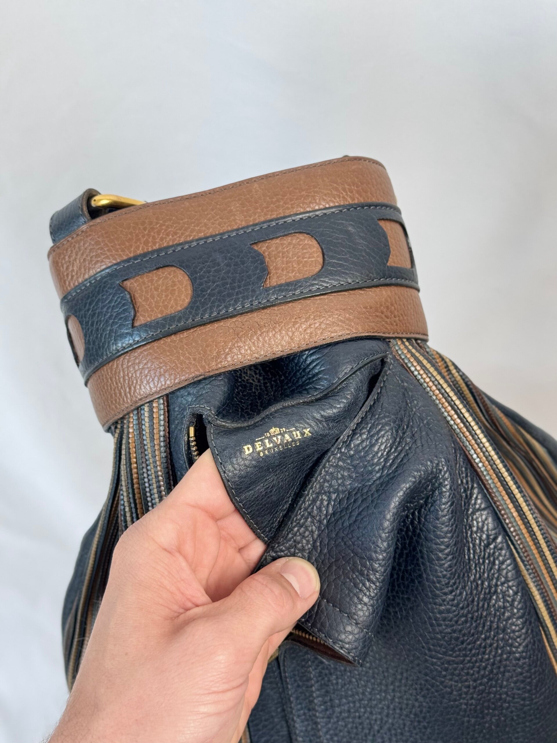 Color: dark blue heavy grained leather with signature TDC in brown shades with golden hardware and dark blue suède inside.