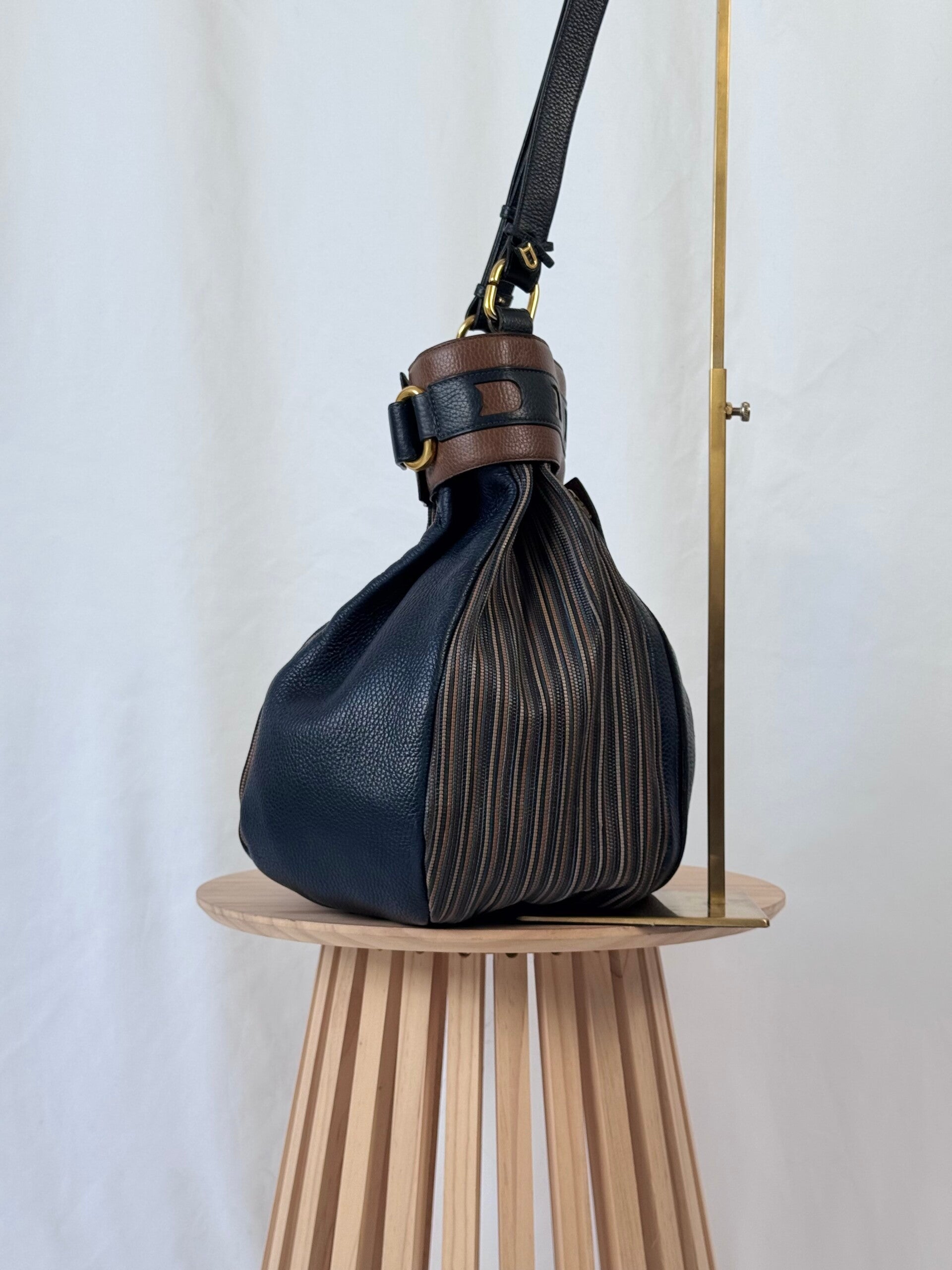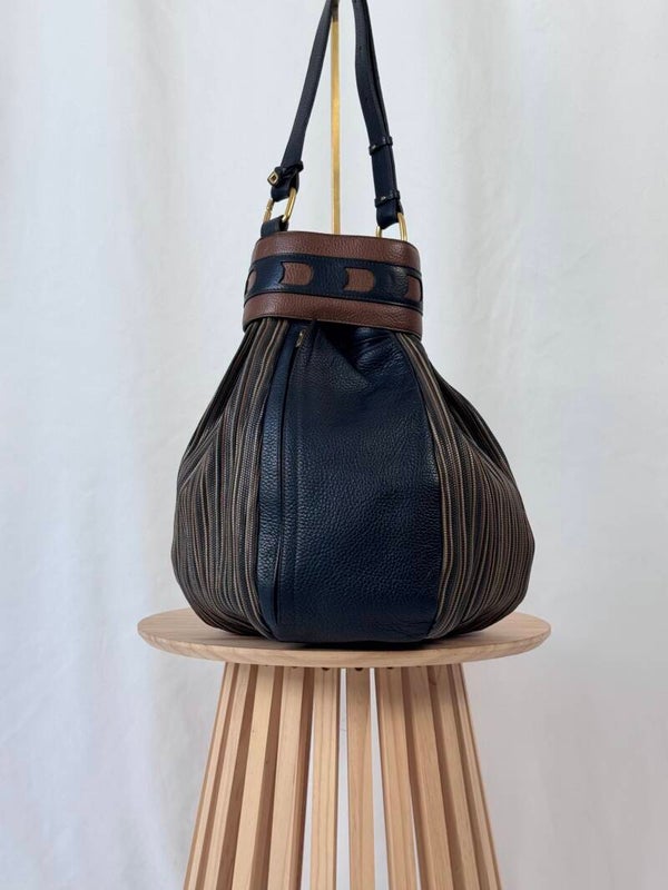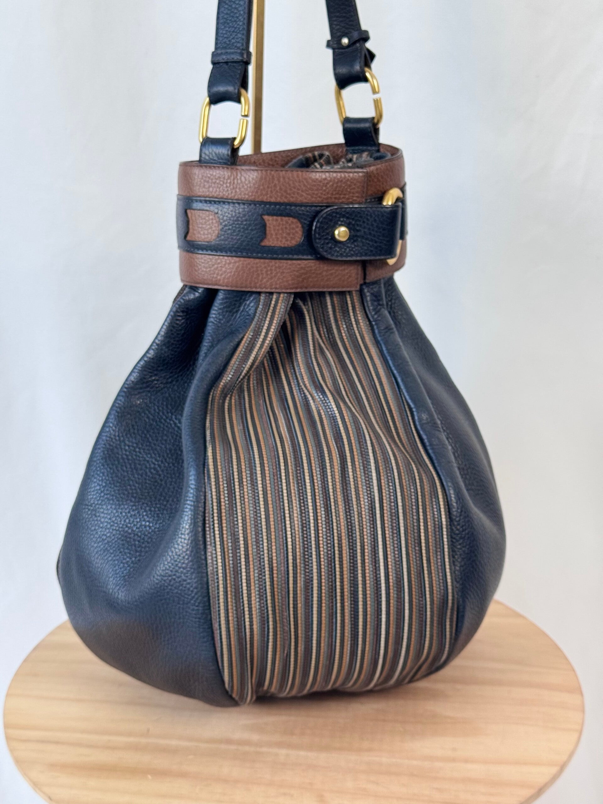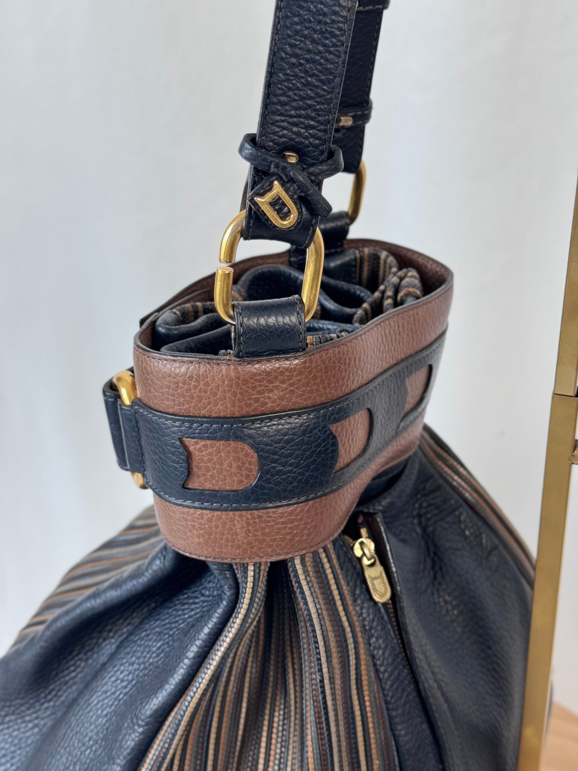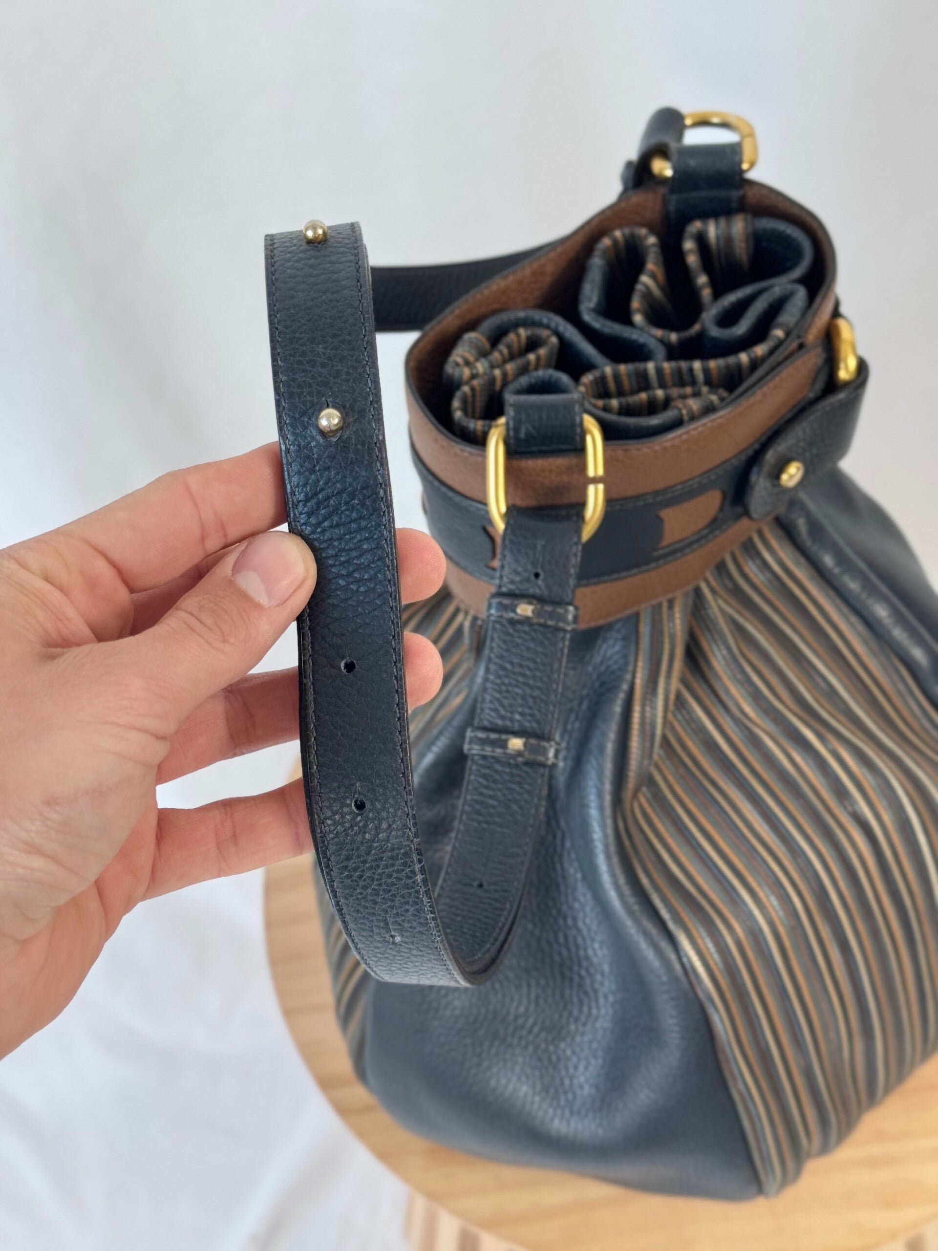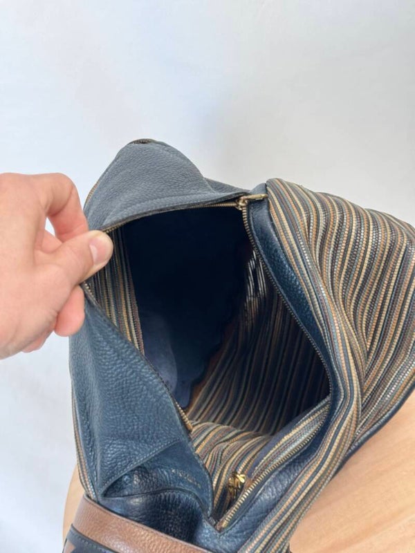 Condition: This is a preloved bag in a very good condition. Dark blue leather is in a wonderful condition. Tan leather and TDC shows minimal signs of earlier use. Inside has been cleaned but shows minimal signs on the suède. Hardware shows minimal discolorations but still looks very good!