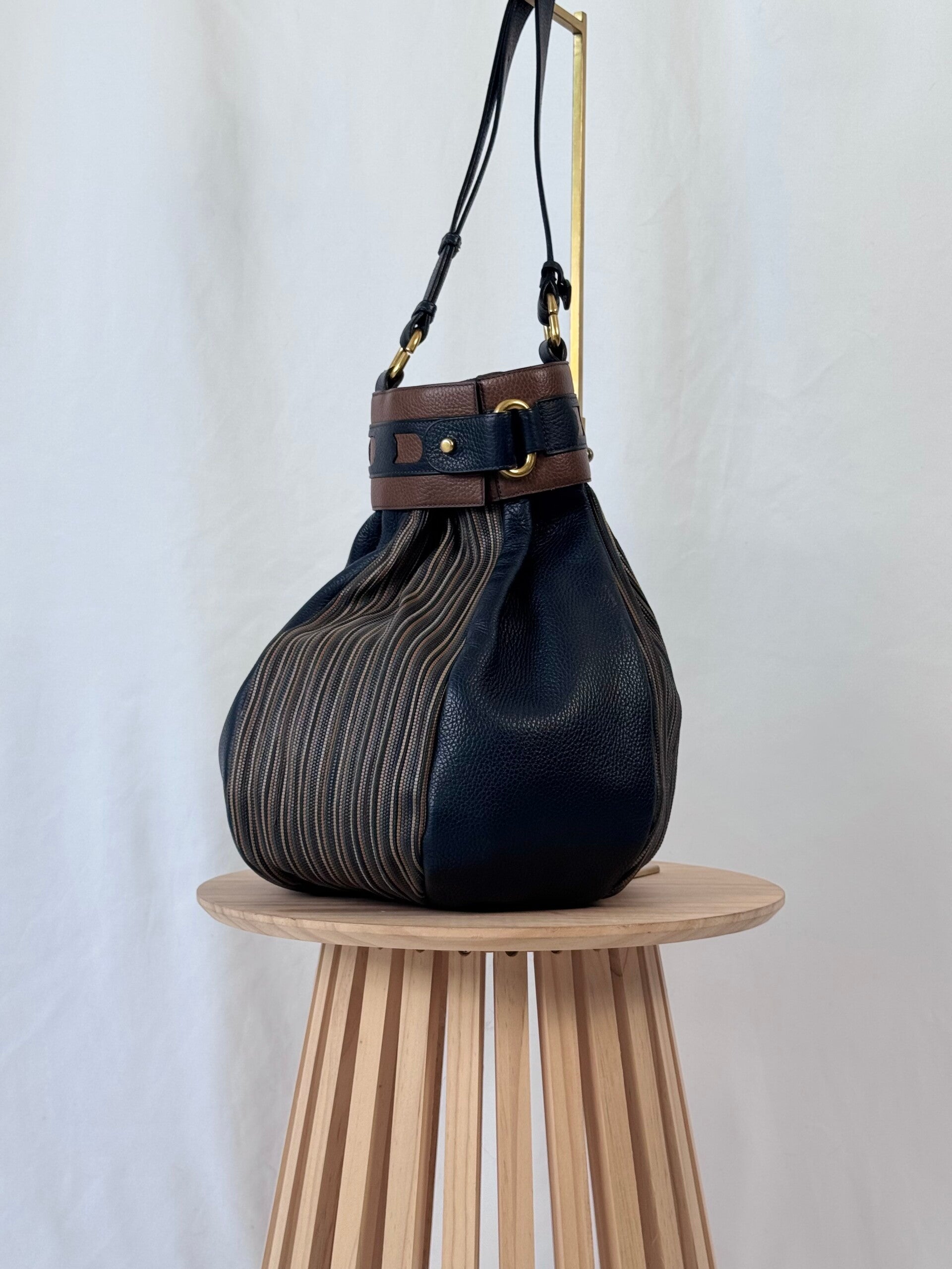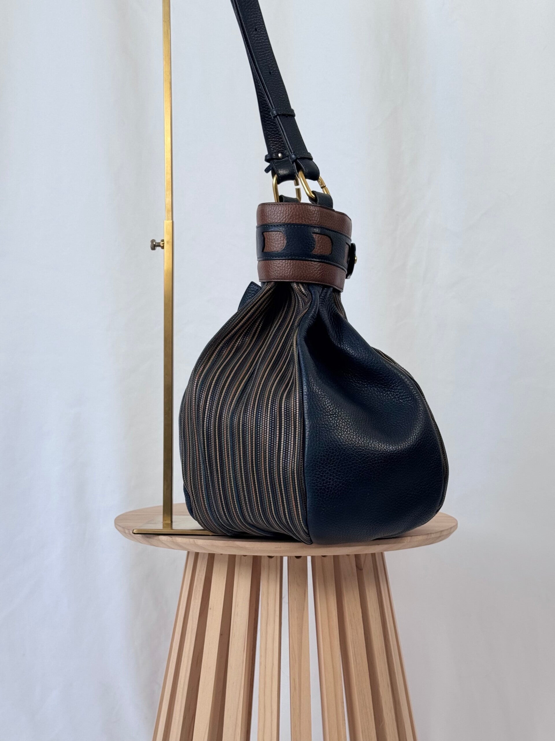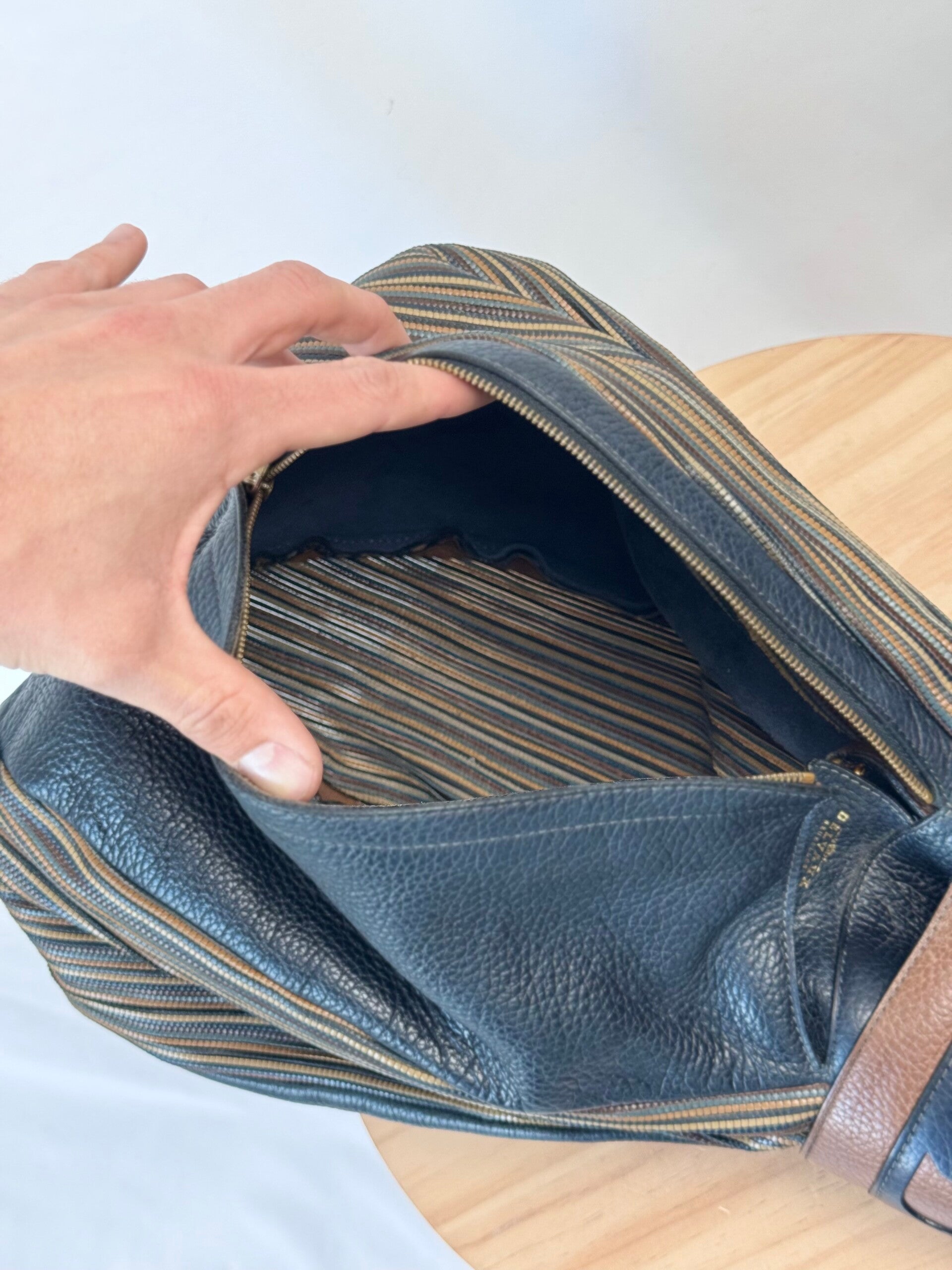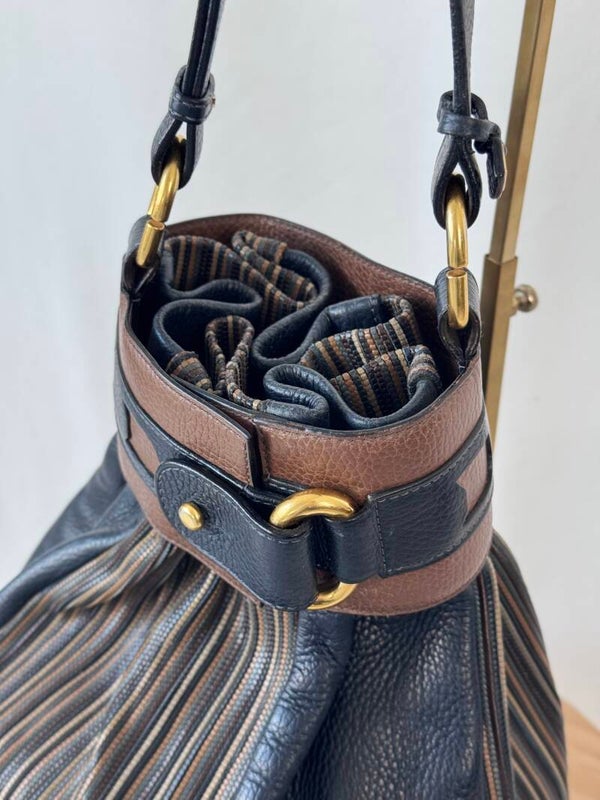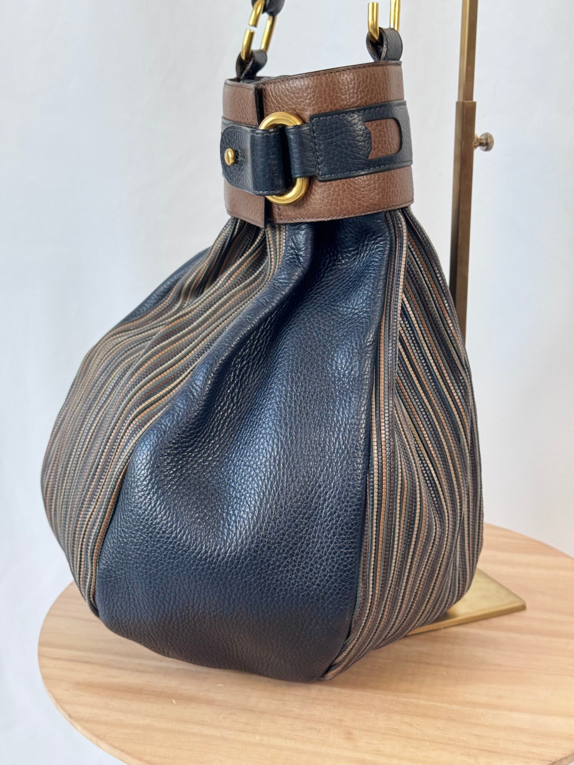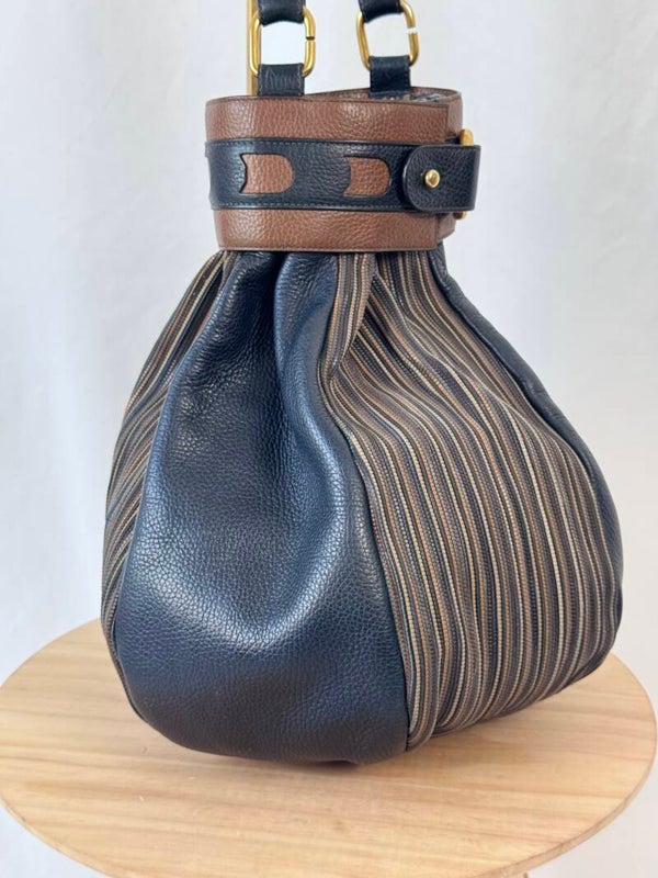 Condition: This is a preloved bag in a very good condition. Dark blue leather is in a wonderful condition. Tan leather and TDC shows minimal signs of earlier use. Inside has been cleaned but shows minimal signs on the suède. Hardware shows minimal discolorations but still looks very good!